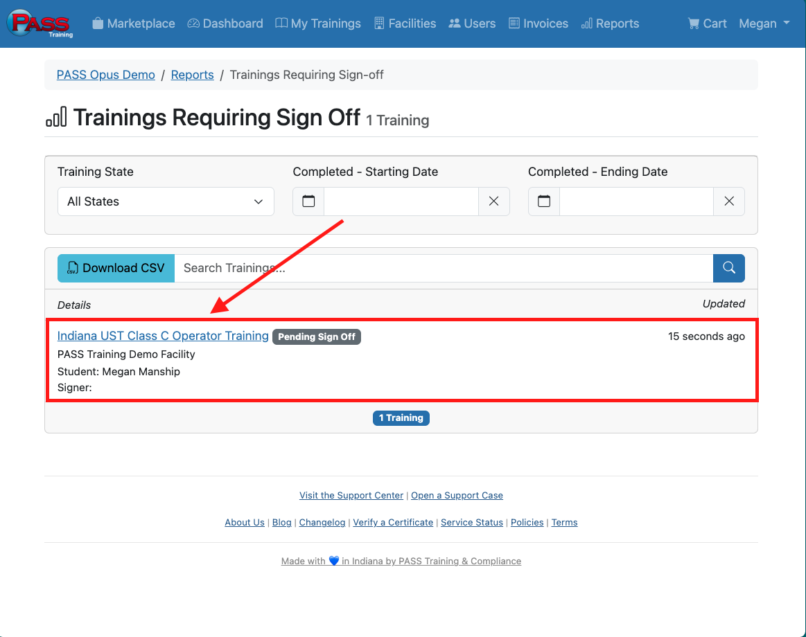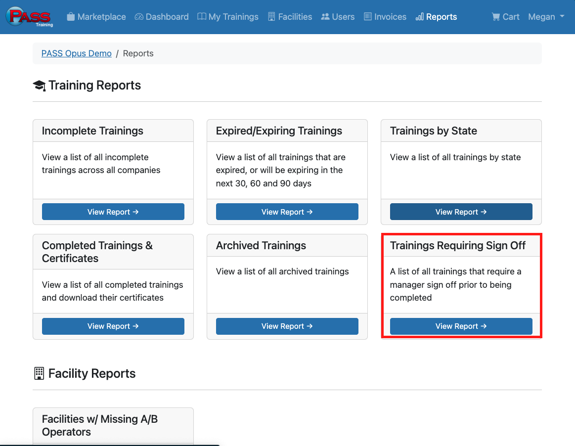 Step 3: Under Trainings Requiring Sign Off, click the blue button that says "View Report."