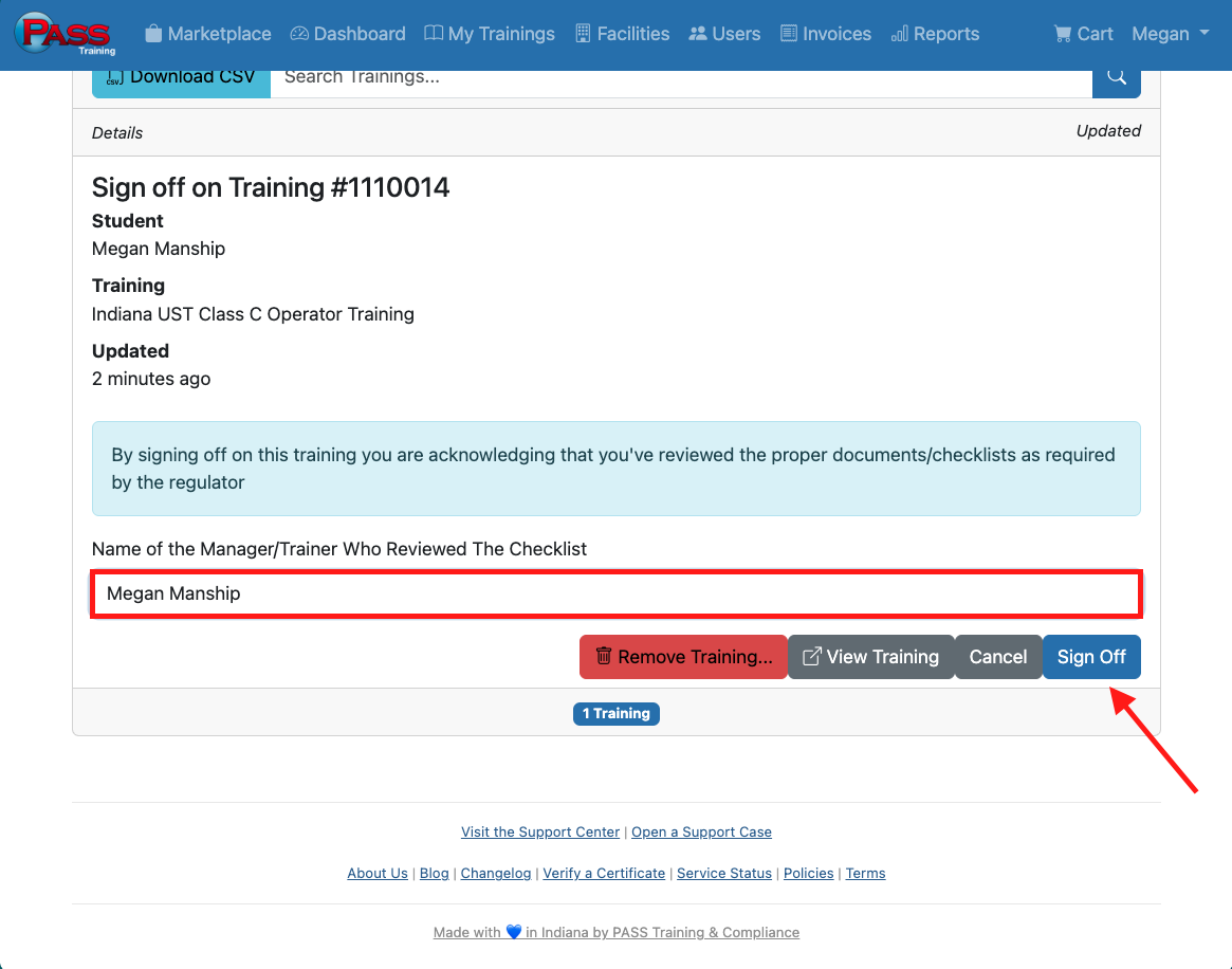 Step 5: Put your name in the box and click the blue "Sign Off" button.