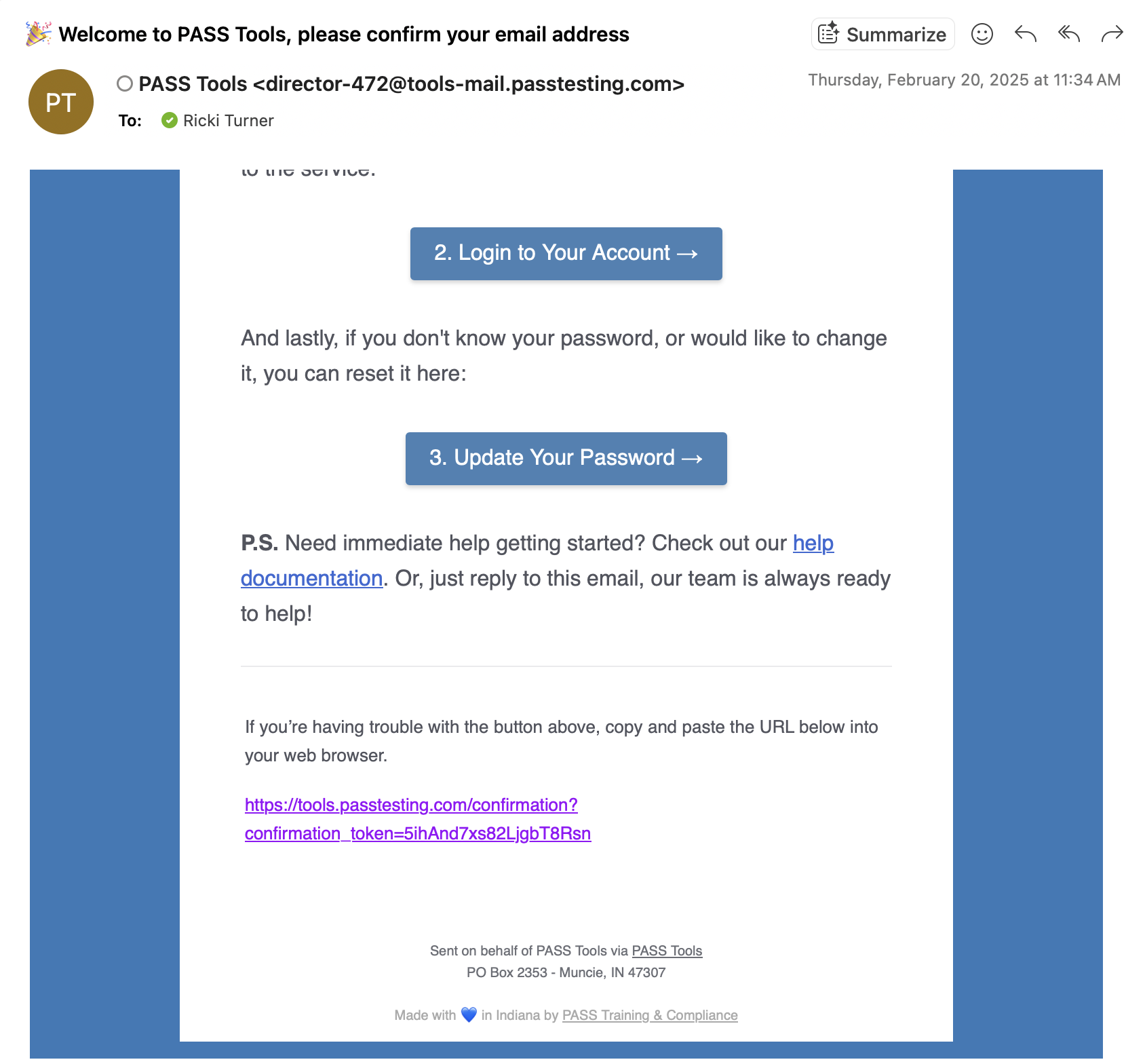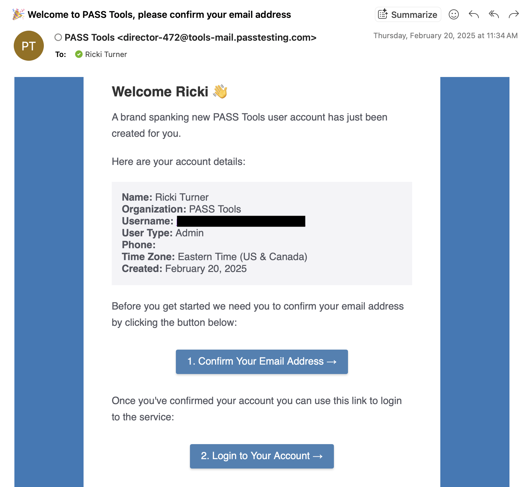 Each time you create a new account in PASS Harmonics, it will send the user an email to confirm the address for security.