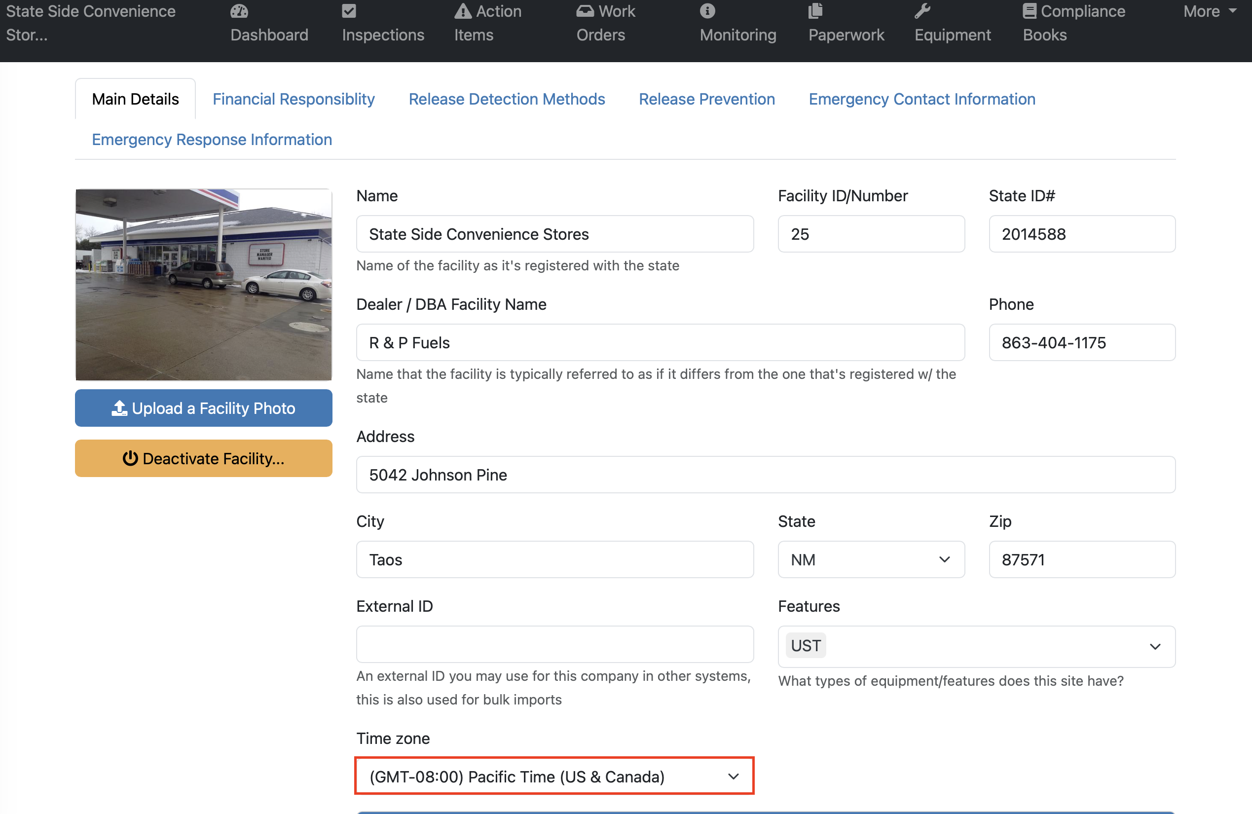 When entering facility details, be sure the correct time zone is selected. This ensures that all time-sensitive items—such as logs, forms, reports, and compliance records—reflect the facility’s local time and helps prevent errors or compliance issues.